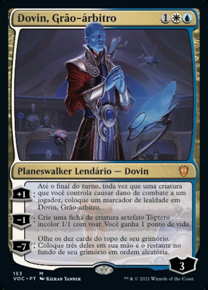 | Rules | +1: Until end of turn, whenever a creature you control deals combat damage to a player, put a loyalty counter on Dovin, Grand Arbiter. −1: Create a 1/1 colorless Thopter artifact creature token with flying. You gain 1 life. −7: Look at the top ten cards of your library. Put three of them into your hand and the rest on the bottom of your library in a random order. |