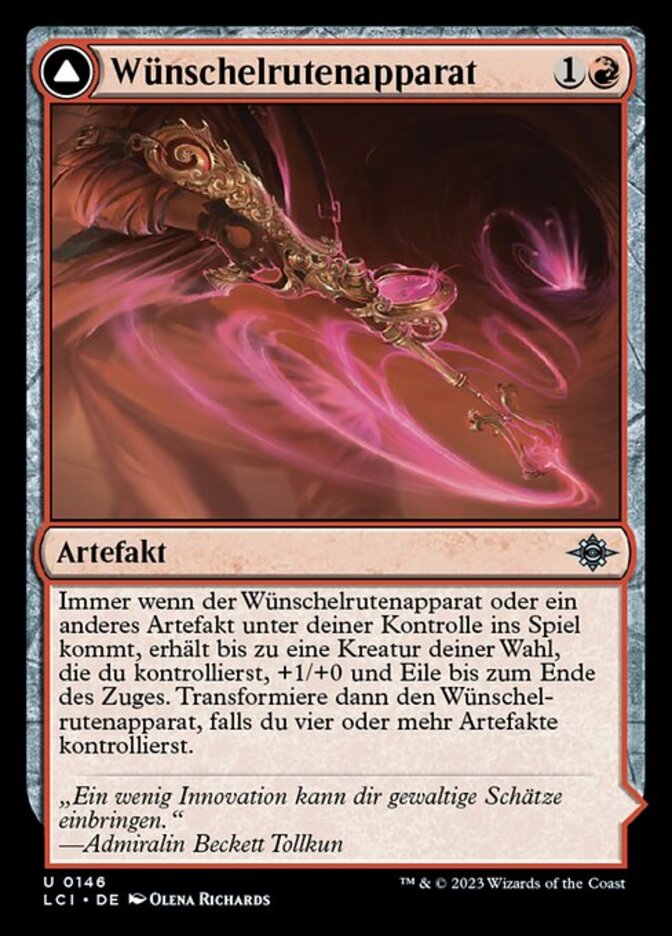 | Rules | Whenever Dowsing Device or another artifact enters the battlefield under your control, up to one target creature you control gets +1/+0 and gains haste until end of turn. Then transform Dowsing Device if you control four or more artifacts. // (Transforms from Dowsing Device.) : Add . , : Until end of turn, target creature gains haste and gets +X/+0, where X is the number of artifacts you control. Activate only as a sorcery. |