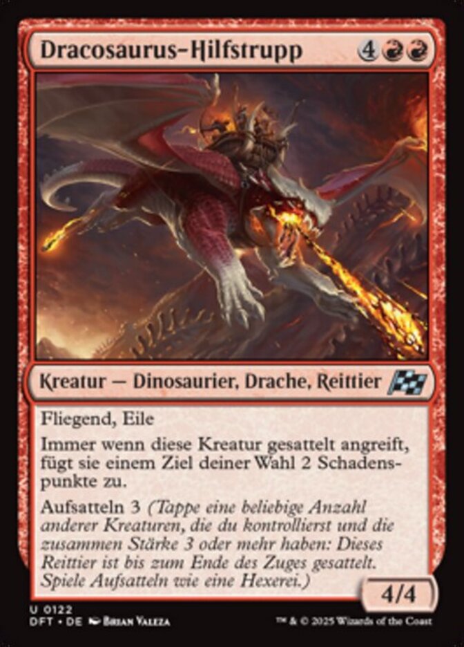 | Rules | Flying, haste Whenever this creature attacks while saddled, it deals 2 damage to any target. Saddle 3 (Tap any number of other creatures you control with total power 3 or more: This Mount becomes saddled until end of turn. Saddle only as a sorcery.) |