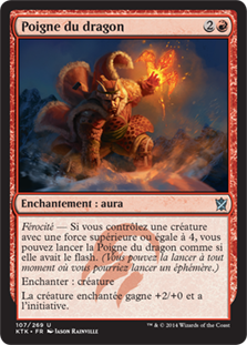 Rules Ferocious — If you control a creature with power 4 or greater, you may cast Dragon Grip as though it had flash. (You may cast it any time you could cast an instant.)