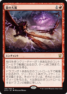 | Rules | Whenever a creature with flying enters the battlefield under your control, it gains haste until end of turn. Whenever a Dragon enters the battlefield under your control, it deals X damage to any target, where X is the number of Dragons you control. |