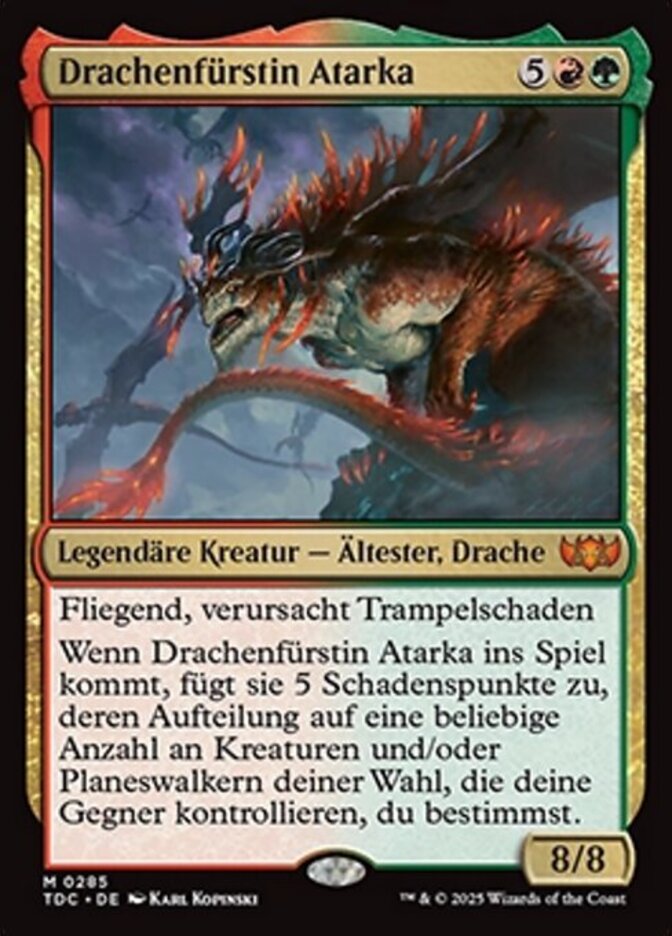 | Rules | Flying, trample When Dragonlord Atarka enters the battlefield, it deals 5 damage divided as you choose among any number of target creatures and/or planeswalkers your opponents control. |