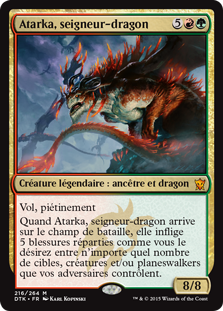 | Rules | Flying, trample When Dragonlord Atarka enters the battlefield, it deals 5 damage divided as you choose among any number of target creatures and/or planeswalkers your opponents control. |