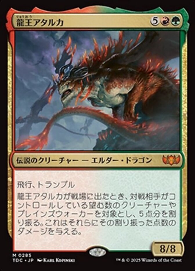 | Rules | Flying, trample When Dragonlord Atarka enters the battlefield, it deals 5 damage divided as you choose among any number of target creatures and/or planeswalkers your opponents control. |