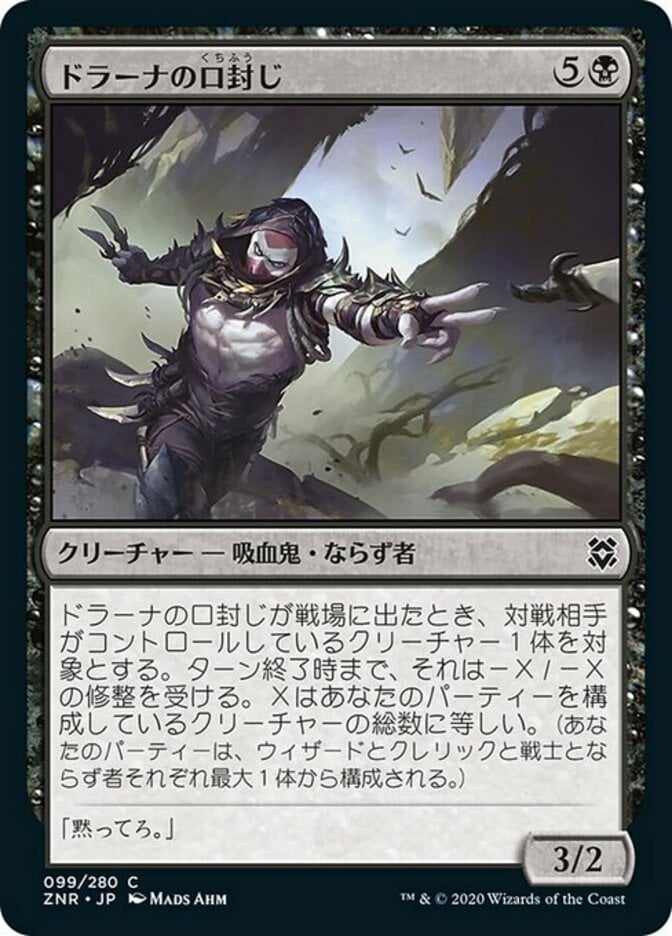 | Rules | When Drana's Silencer enters the battlefield, target creature an opponent controls gets -X/-X until end of turn, where X is the number of creatures in your party. (Your party consists of up to one each of Cleric, Rogue, Warrior, and Wizard.) |