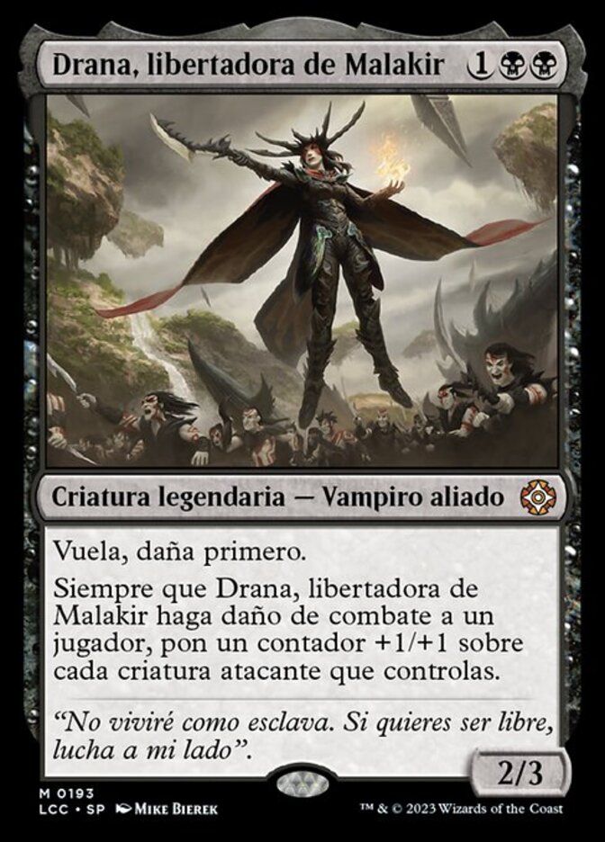 | Rules | Flying, first strike Whenever Drana, Liberator of Malakir deals combat damage to a player, put a +1/+1 counter on each attacking creature you control. |