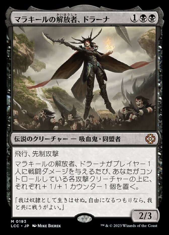 | Rules | Flying, first strike Whenever Drana, Liberator of Malakir deals combat damage to a player, put a +1/+1 counter on each attacking creature you control. |