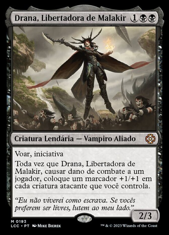 | Rules | Flying, first strike Whenever Drana, Liberator of Malakir deals combat damage to a player, put a +1/+1 counter on each attacking creature you control. |