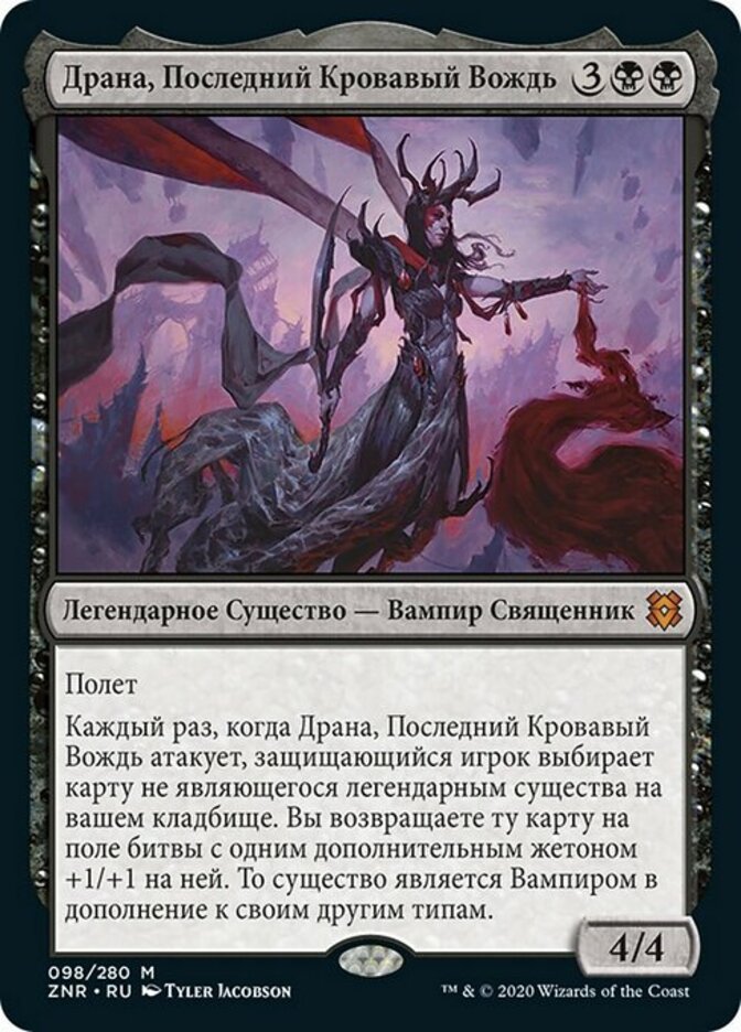 | Rules | Flying Whenever Drana, the Last Bloodchief attacks, defending player chooses a nonlegendary creature card in your graveyard. You return that card to the battlefield with an additional +1/+1 counter on it. The creature is a Vampire in addition to its other types. |