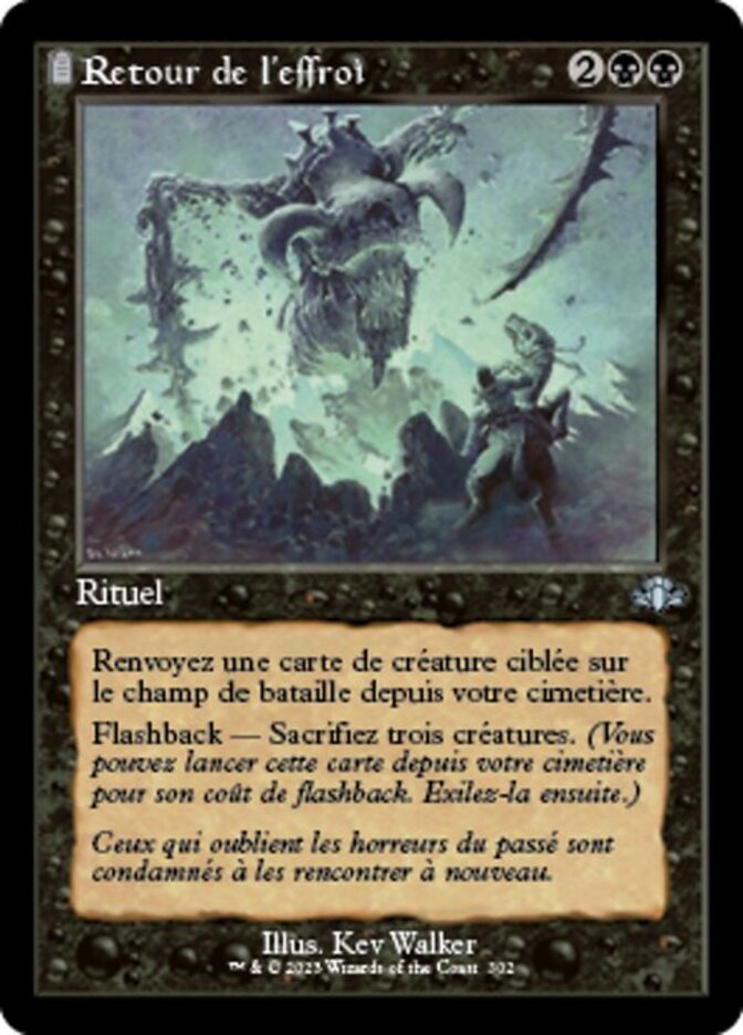 | Rules | Return target creature card from your graveyard to the battlefield. Flashback—Sacrifice three creatures. (You may cast this card from your graveyard for its flashback cost. Then exile it.) |