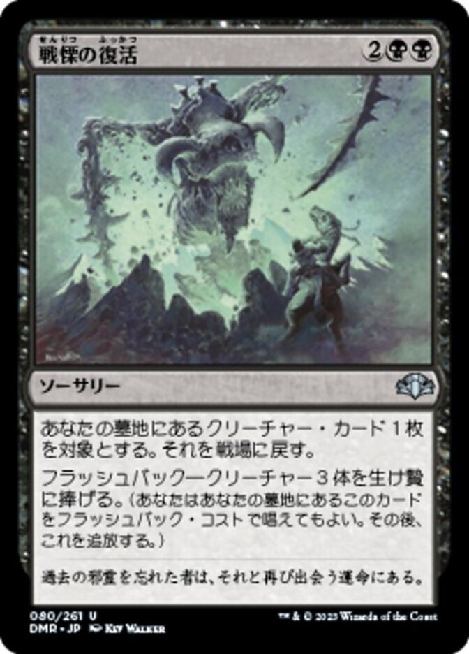 | Rules | Return target creature card from your graveyard to the battlefield. Flashback—Sacrifice three creatures. (You may cast this card from your graveyard for its flashback cost. Then exile it.) |