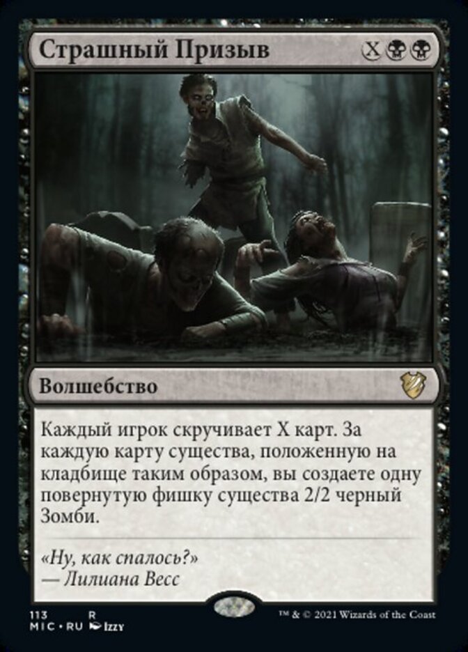| Rules | Each player mills X cards. For each creature card put into a graveyard this way, you create a tapped 2/2 black Zombie creature token. |