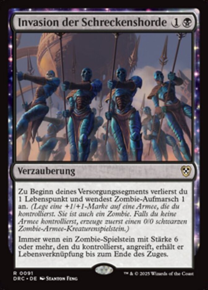 | Rules | At the beginning of your upkeep, you lose 1 life and amass 1. (Put a +1/+1 counter on an Army you control. If you don't control one, create a 0/0 black Zombie Army creature token first.) Whenever a Zombie token you control with power 6 or greater attacks, it gains lifelink until end of turn. |