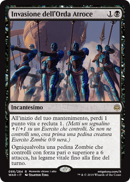 | Rules | At the beginning of your upkeep, you lose 1 life and amass 1. (Put a +1/+1 counter on an Army you control. If you don't control one, create a 0/0 black Zombie Army creature token first.) Whenever a Zombie token you control with power 6 or greater attacks, it gains lifelink until end of turn. |