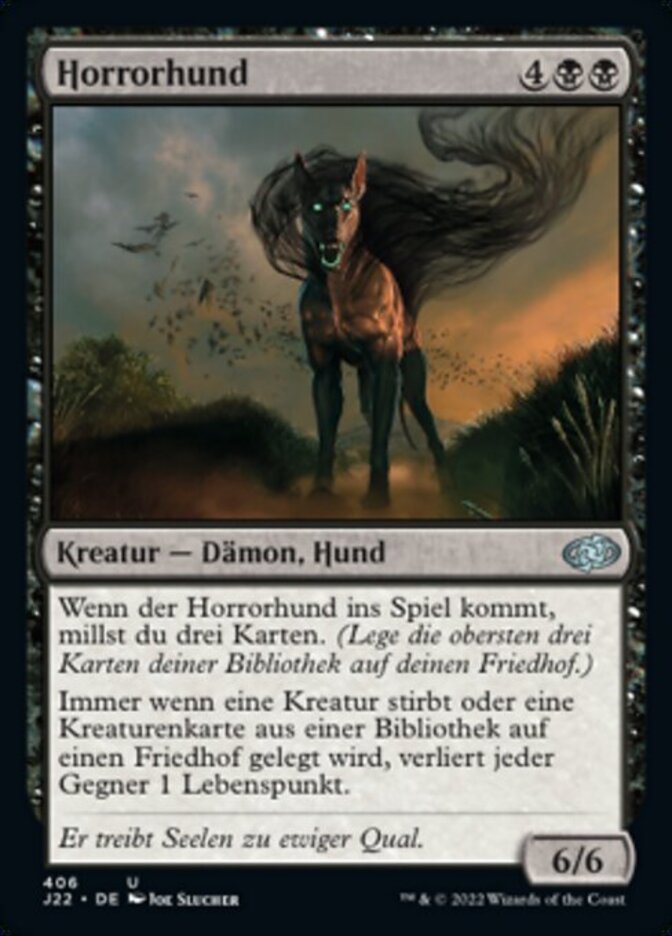 | Rules | When Dreadhound enters the battlefield, mill three cards. (Put the top three cards of your library into your graveyard.) Whenever a creature dies or a creature card is put into a graveyard from a library, each opponent loses 1 life. |
