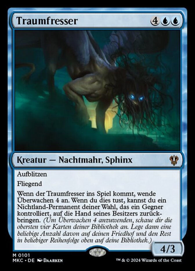 | Rules | Flash Flying When Dream Eater enters the battlefield, surveil 4. When you do, you may return target nonland permanent an opponent controls to its owner's hand. (To surveil 4, look at the top four cards of your library, then put any number of them into your graveyard and the rest on top of your library in any order.) |