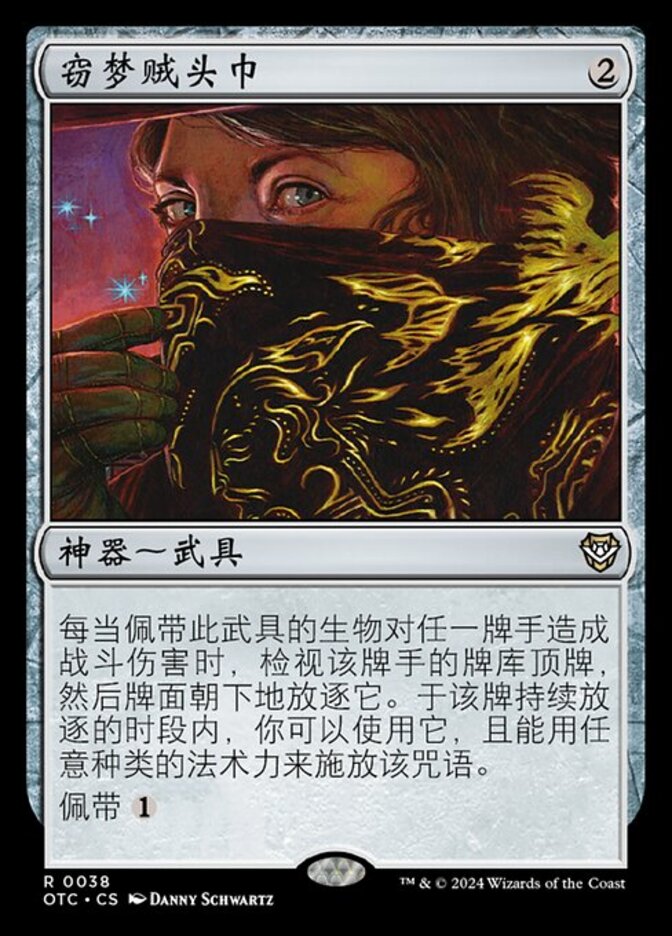 | Rules | Whenever equipped creature deals combat damage to a player, look at the top card of their library, then exile it face down. For as long as it remains exiled, you may play it, and mana of any type can be spent to cast that spell. Equip |