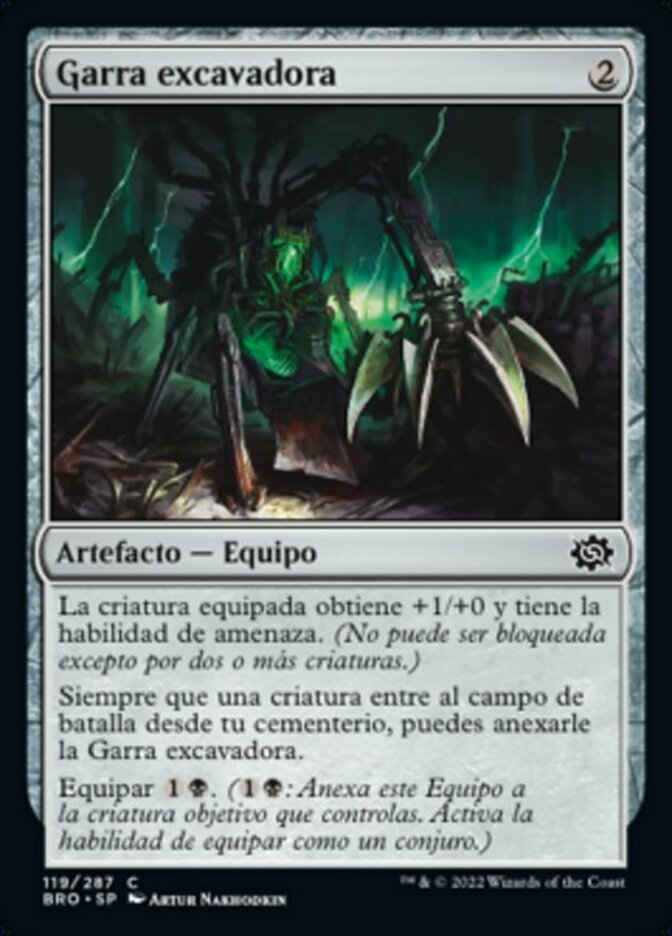 | Rules | Equipped creature gets +1/+0 and has menace. (It's can't be blocked except by two or more creatures.) Whenever a creature enters the battlefield from your graveyard, you may attach Dredging Claw to it. Equip (: Attach to target creature you control. Equip only as a sorcery.) |