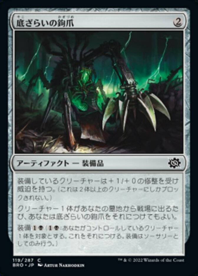 | Rules | Equipped creature gets +1/+0 and has menace. (It's can't be blocked except by two or more creatures.) Whenever a creature enters the battlefield from your graveyard, you may attach Dredging Claw to it. Equip (: Attach to target creature you control. Equip only as a sorcery.) |