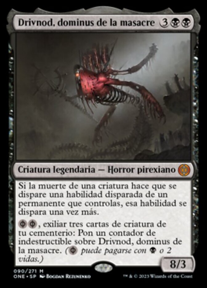 | Rules | If a creature dying causes a triggered ability of a permanent you control to trigger, that ability triggers an additional time. , Exile three creature cards from your graveyard: Put an indestructible counter on Drivnod, Carnage Dominus. ( can be paid with either or 2 life.) |