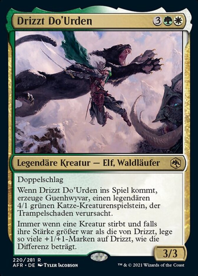 | Rules | Double strike When Drizzt Do'Urden enters the battlefield, create Guenhwyvar, a legendary 4/1 green Cat creature token with trample. Whenever a creature dies, if it had power greater than Drizzt's power, put a number of +1/+1 counters on Drizzt equal to the difference. |