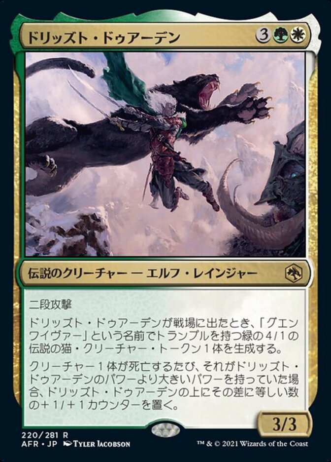 | Rules | Double strike When Drizzt Do'Urden enters the battlefield, create Guenhwyvar, a legendary 4/1 green Cat creature token with trample. Whenever a creature dies, if it had power greater than Drizzt's power, put a number of +1/+1 counters on Drizzt equal to the difference. |