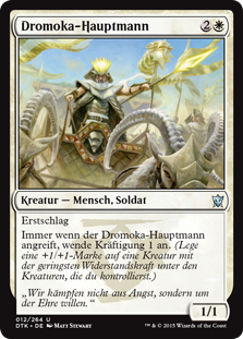 | Rules | First strike Whenever Dromoka Captain attacks, bolster 1. (Choose a creature with the least toughness among creatures you control and put a +1/+1 counter on it.) |