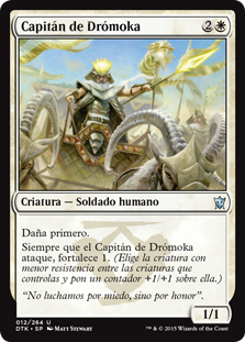 | Rules | First strike Whenever Dromoka Captain attacks, bolster 1. (Choose a creature with the least toughness among creatures you control and put a +1/+1 counter on it.) |