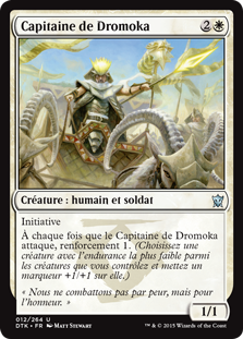 | Rules | First strike Whenever Dromoka Captain attacks, bolster 1. (Choose a creature with the least toughness among creatures you control and put a +1/+1 counter on it.) |