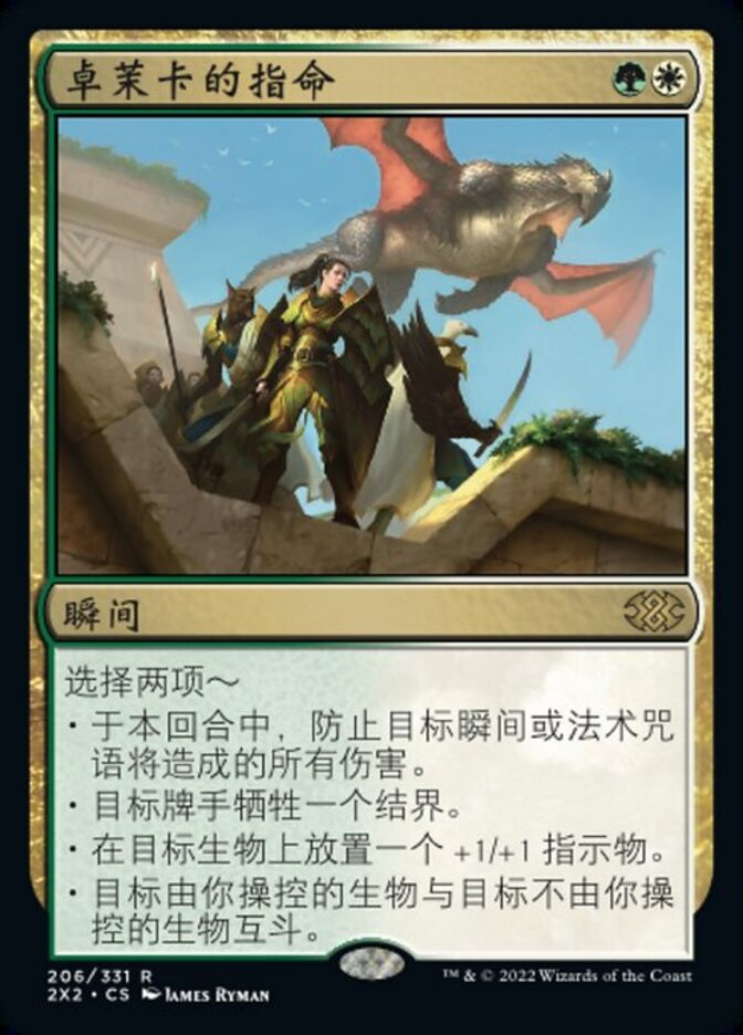 | Rules | Choose two — • Prevent all damage target instant or sorcery spell would deal this turn. • Target player sacrifices an enchantment. • Put a +1/+1 counter on target creature. • Target creature you control fights target creature you don't control. |