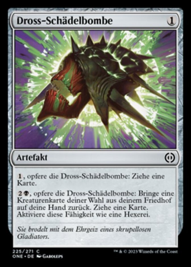 | Rules | , Sacrifice Dross Skullbomb: Draw a card. , Sacrifice Dross Skullbomb: Return target creature card from your graveyard to your hand. Draw a card. Activate only as a sorcery. |