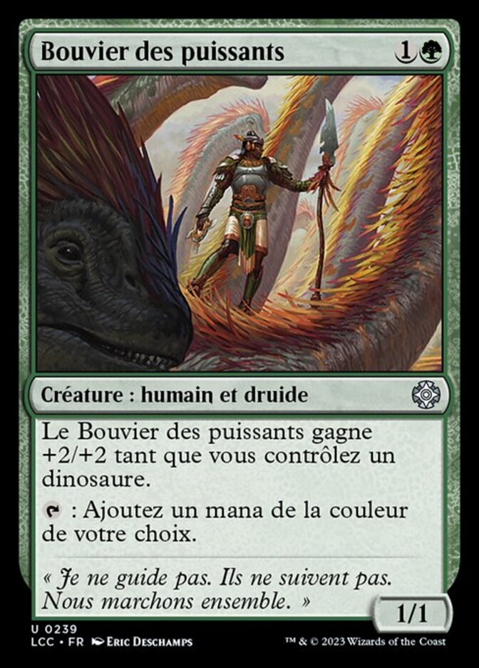| Rules | Drover of the Mighty gets +2/+2 as long as you control a Dinosaur. : Add one mana of any color. |