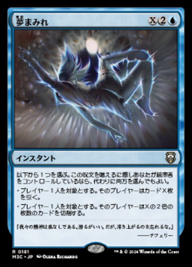 | Rules | Choose one. If you control a commander as you cast this spell, you may choose both. • Target player draws X cards. • Target player mills twice X cards. |