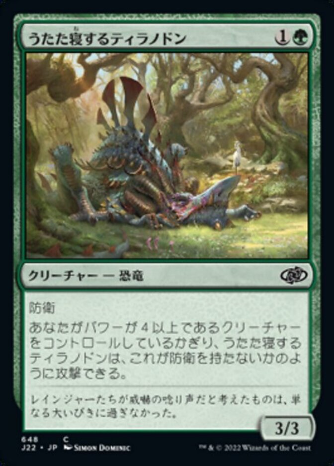 | Rules | Defender (This creature can't attack.) As long as you control a creature with power 4 or greater, Drowsing Tyrannodon can attack as though it didn't have defender. |