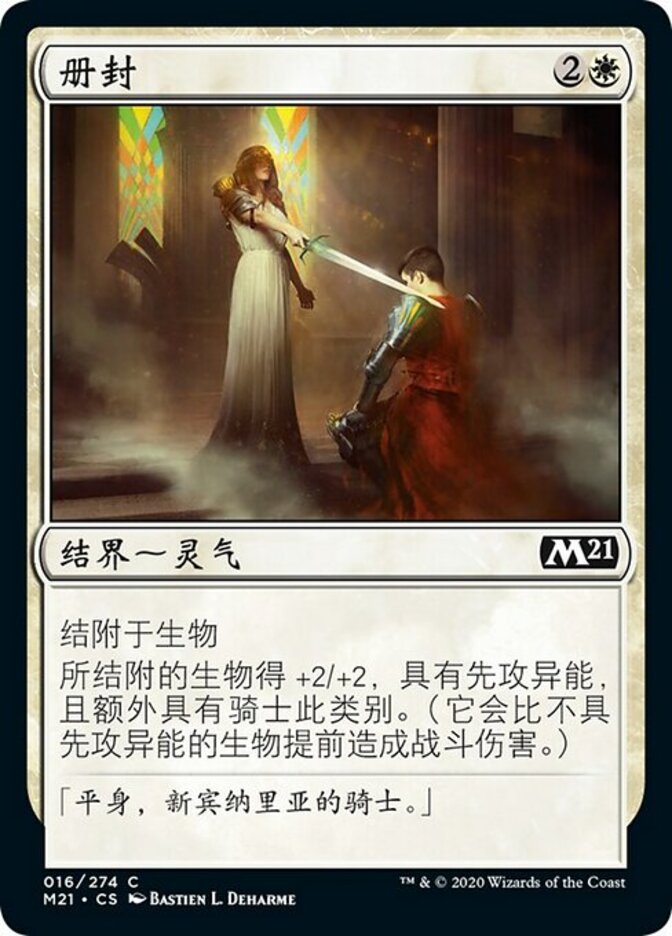 | Rules | Enchant creature Enchanted creature gets +2/+2, has first strike, and is a Knight in addition to its other types. (It deals combat damage before creatures without first strike.) |