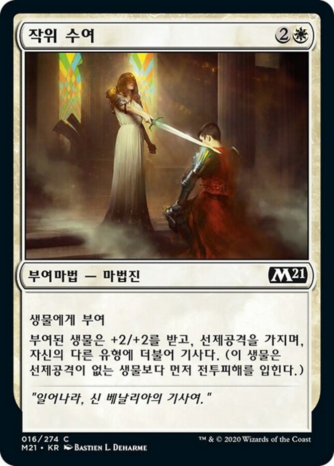 | Rules | Enchant creature Enchanted creature gets +2/+2, has first strike, and is a Knight in addition to its other types. (It deals combat damage before creatures without first strike.) |