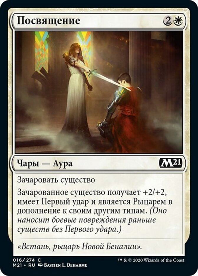 | Rules | Enchant creature Enchanted creature gets +2/+2, has first strike, and is a Knight in addition to its other types. (It deals combat damage before creatures without first strike.) |