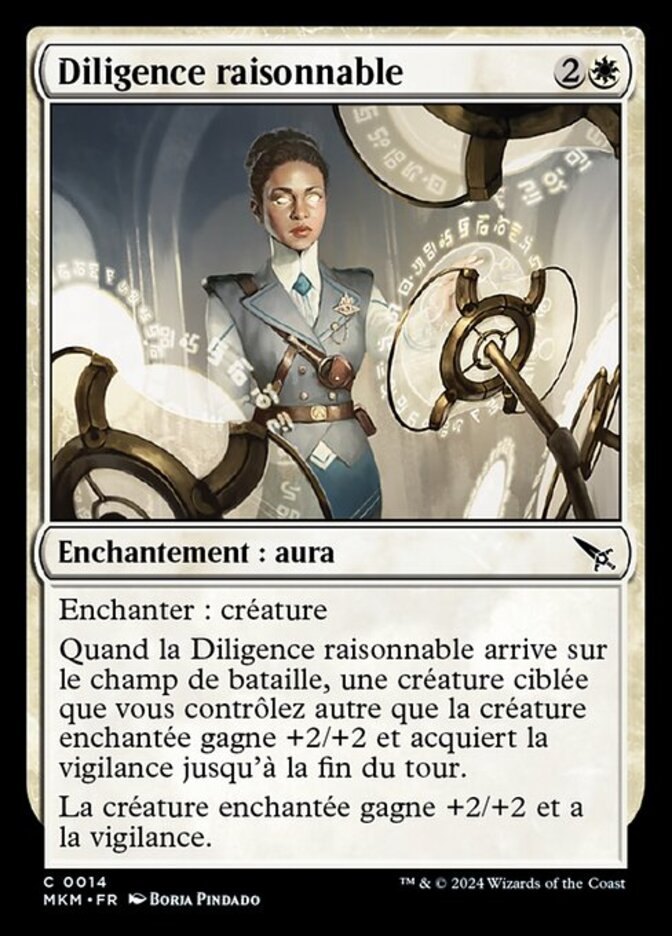 | Rules | Enchant creature When Due Diligence enters the battlefield, target creature you control other than enchanted creature gets +2/+2 and gains vigilance until end of turn. Enchanted creature gets +2/+2 and has vigilance. |
