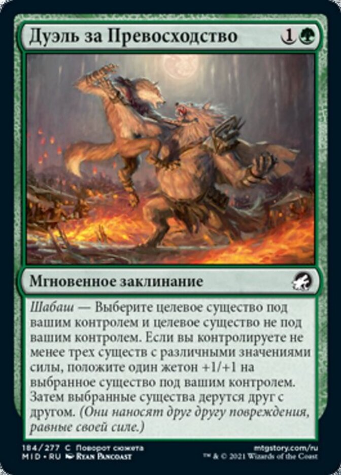 | Rules | Coven — Choose target creature you control and target creature you don't control. If you control three or more creatures with different powers, put a +1/+1 counter on the chosen creature you control. Then the chosen creatures fight each other. (They each deal damage equal to their power to the other.) |