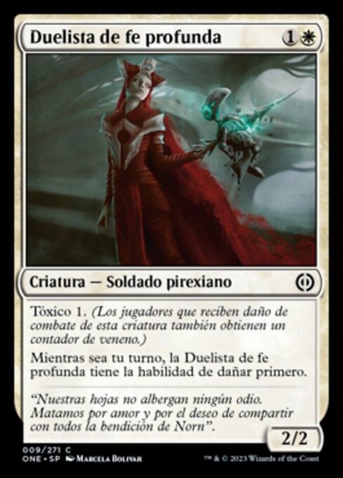 | Rules | Toxic 1 (Players dealt combat damage by this creature also get a poison counter.) As long as it's your turn, Duelist of Deep Faith has first strike. |