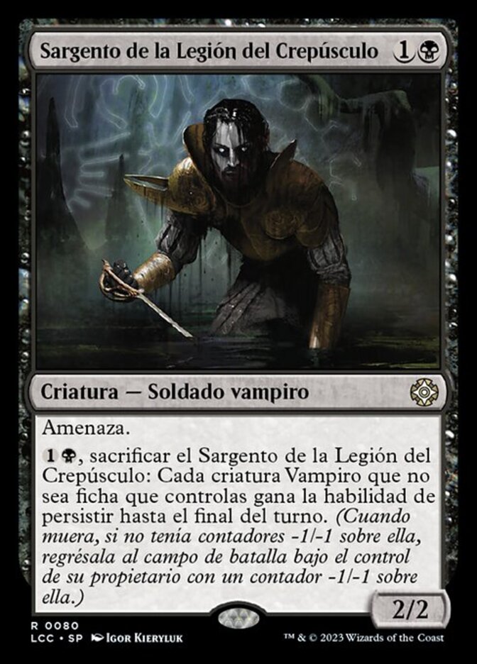 | Rules | Menace , Sacrifice Dusk Legion Sergeant: Each nontoken Vampire creature you control gains persist until end of turn. (When it dies, if it had no -1/-1 counters on it, return it to the battlefield under its owner's control with a -1/-1 counter on it.) |
