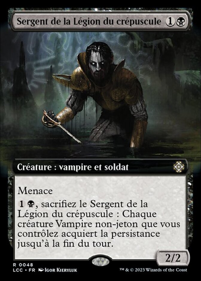 | Rules | Menace , Sacrifice Dusk Legion Sergeant: Each nontoken Vampire creature you control gains persist until end of turn. (When it dies, if it had no -1/-1 counters on it, return it to the battlefield under its owner's control with a -1/-1 counter on it.) |