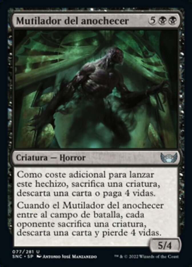 | Rules | As an additional cost to cast this spell, sacrifice a creature, discard a card, or pay 4 life. When Dusk Mangler enters the battlefield, each opponent sacrifices a creature, discards a card, and loses 4 life. |
