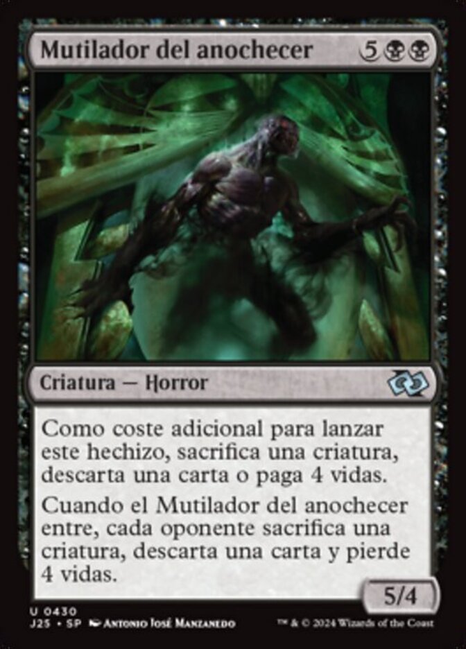 | Rules | As an additional cost to cast this spell, sacrifice a creature, discard a card, or pay 4 life. When Dusk Mangler enters the battlefield, each opponent sacrifices a creature, discards a card, and loses 4 life. |