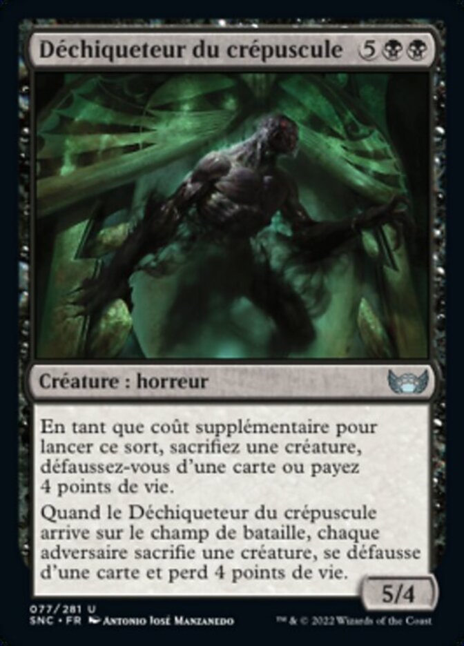 | Rules | As an additional cost to cast this spell, sacrifice a creature, discard a card, or pay 4 life. When Dusk Mangler enters the battlefield, each opponent sacrifices a creature, discards a card, and loses 4 life. |