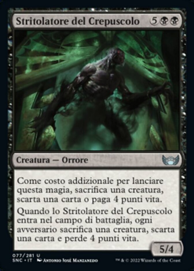 | Rules | As an additional cost to cast this spell, sacrifice a creature, discard a card, or pay 4 life. When Dusk Mangler enters the battlefield, each opponent sacrifices a creature, discards a card, and loses 4 life. |
