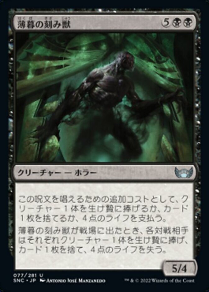 | Rules | As an additional cost to cast this spell, sacrifice a creature, discard a card, or pay 4 life. When Dusk Mangler enters the battlefield, each opponent sacrifices a creature, discards a card, and loses 4 life. |