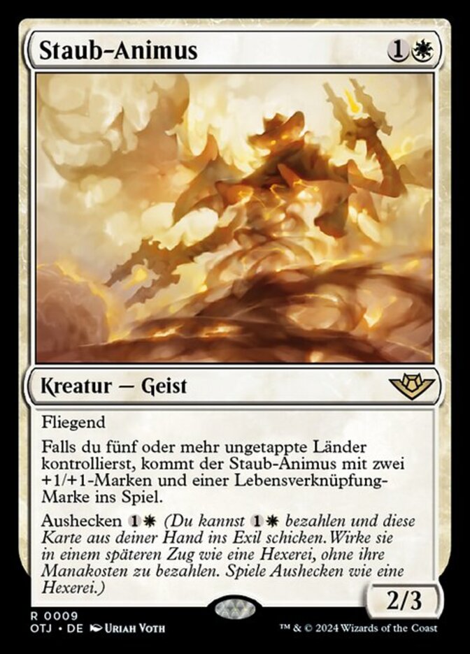 | Rules | Flying If you control five or more untapped lands, Dust Animus enters the battlefield with two +1/+1 counters and a lifelink counter on it. Plot (You may pay and exile this card from your hand. Cast it as a sorcery on a later turn without paying its mana cost. Plot only as a sorcery.) |