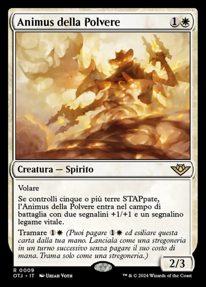 | Rules | Flying If you control five or more untapped lands, Dust Animus enters the battlefield with two +1/+1 counters and a lifelink counter on it. Plot (You may pay and exile this card from your hand. Cast it as a sorcery on a later turn without paying its mana cost. Plot only as a sorcery.) |