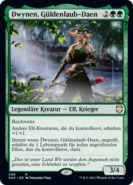 | Rules | Reach Other Elf creatures you control get +1/+1. Whenever Dwynen, Gilt-Leaf Daen attacks, you gain 1 life for each attacking Elf you control. |